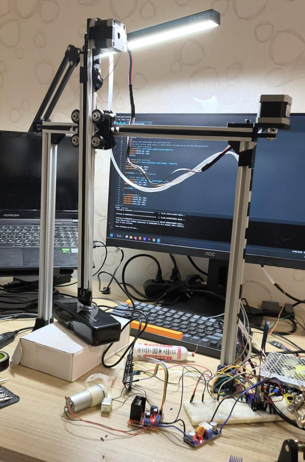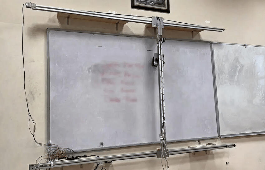 This system is designed to increase efficiency in high-usage areas such as schools and offices by automating the cleaning of whiteboards. It was developed using a GT2 belt mechanism and three Nema 17 stepper motors (two for the X-axis and one for the Y-axis) to achieve precise linear motion along the X and Y axes.The cleaning head features an eraser mechanism powered by a 6V high-torque DC motor that rotates around its own axis to effectively remove ink from the surface. The project’s control unit is based on an Arduino, and the system is triggered via a physical button. For future development, integration with a mobile application using ESP32 and remote control capabilities are planned.